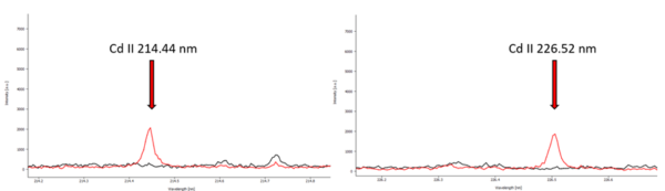 Detection of Cd in certified coating (black line) and non-certified coating (red line)